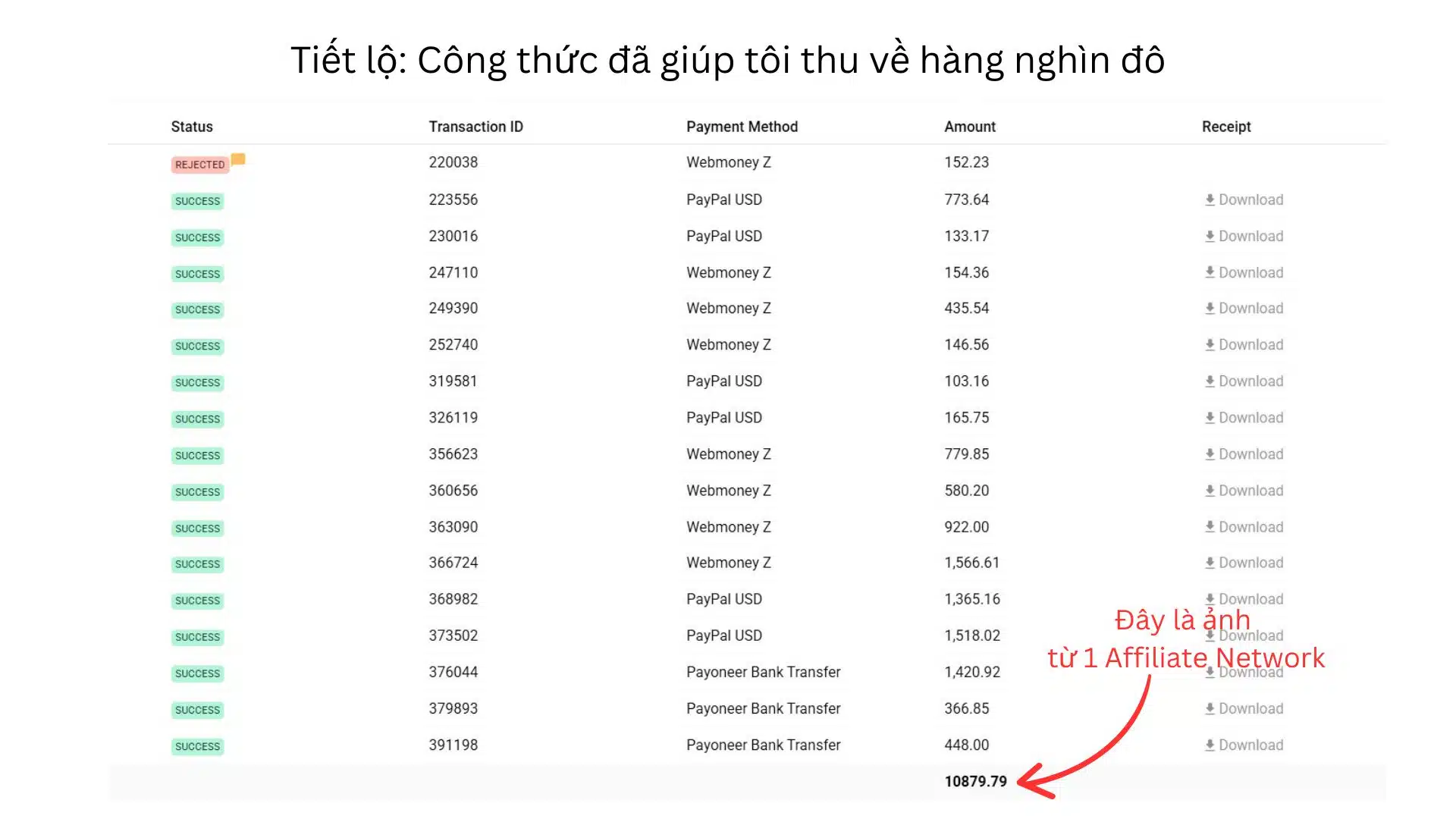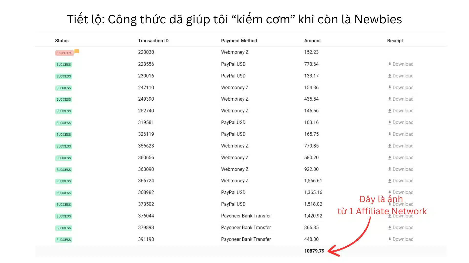 Đây chính là những số tiền đầu tiên mà tôi kiếm được, từ kinh doanh online. Đây là lịch sử thanh toán từ Affiliate Network từ những ngày đầu làm affiliate của tôi: