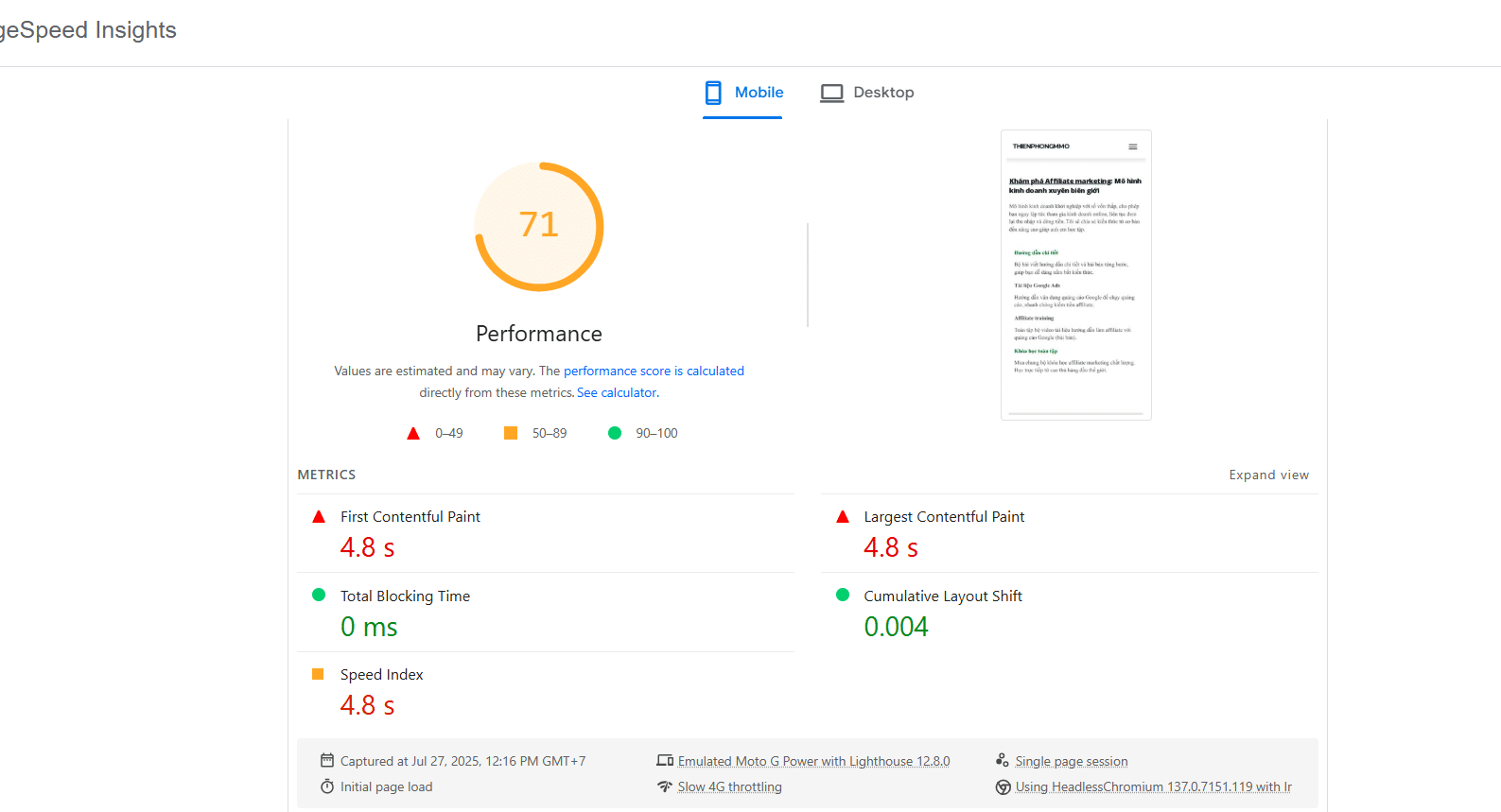 - Nếu điểm thấp (< 70), Google sẽ chỉ ra nguyên nhân cụ thể: ảnh nặng, script chặn hiển thị, hosting chậm…