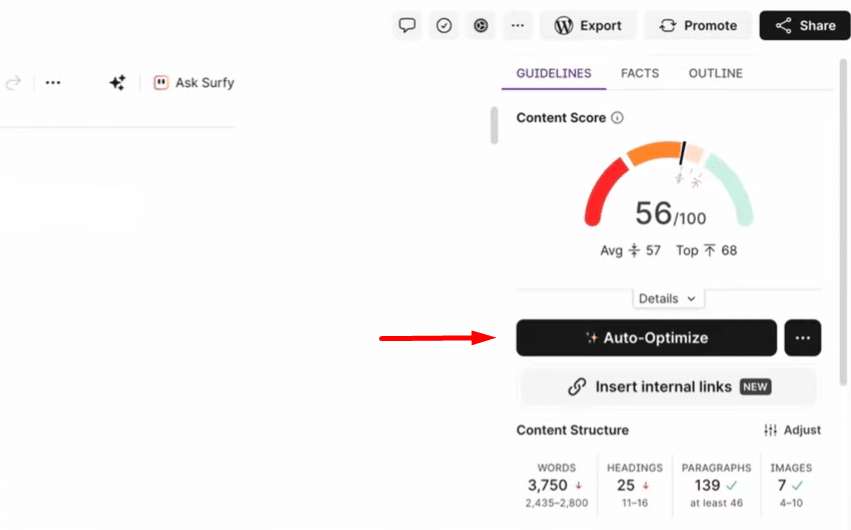 Sau khi xác định bài cần chỉnh, tôi mở trực tiếp trong Content Editor của Surfer.